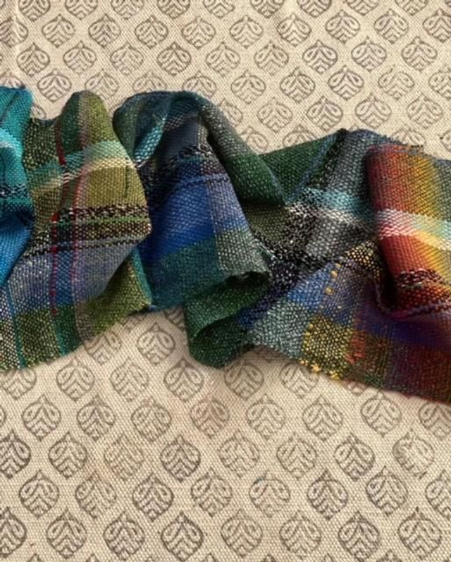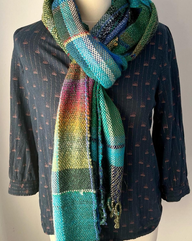 Kleurrijke handgeweven shawl. Blauw-groen gecombineerd met warme, vrolijke kleuren.